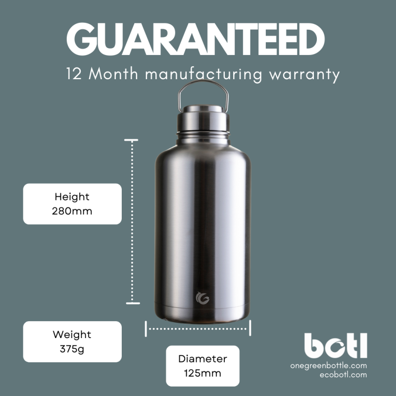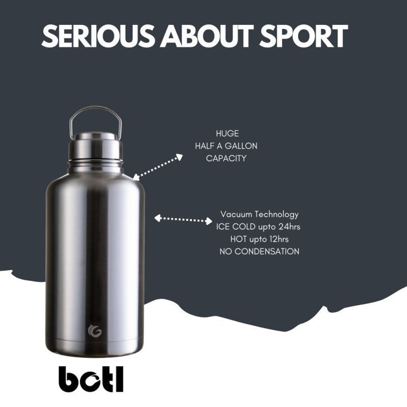 64oz / c.2000ml thermal insulated Canteen stainless steel water bottle supplied with stainless steel screw cap with handle. Newly updated Epic bottle – with Lois O’Hara design logo. Beer Growler, Gym keg, Daily water intake reminder.