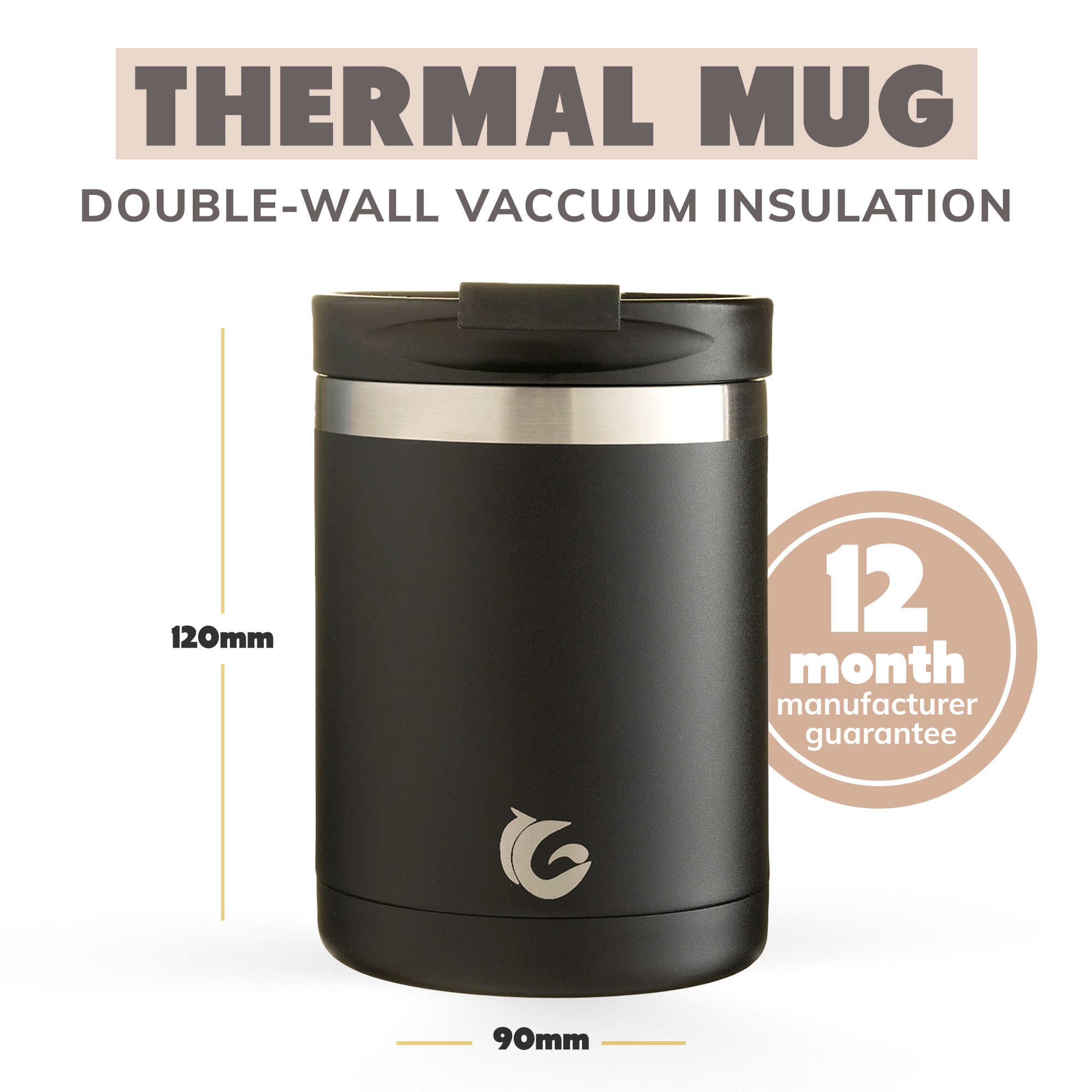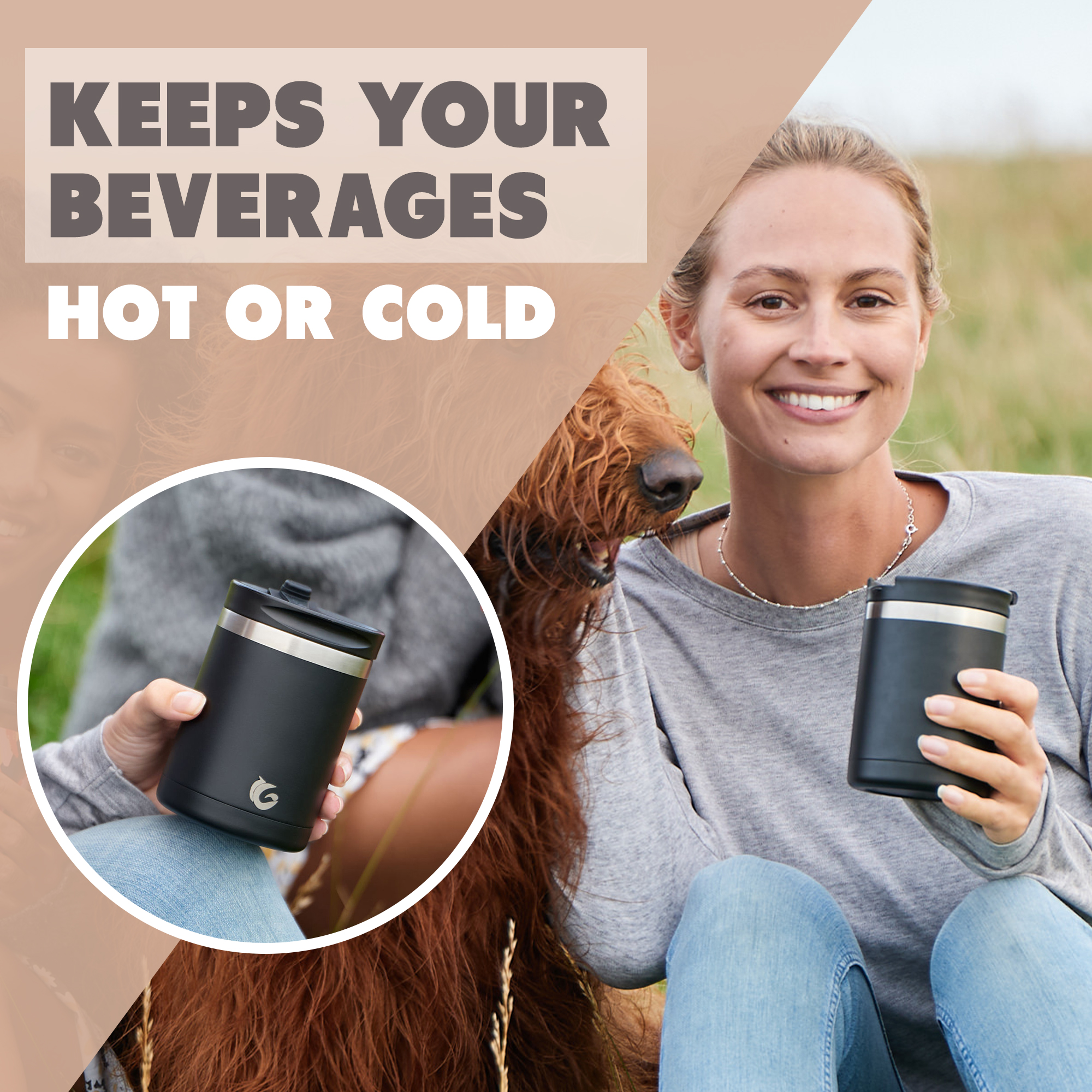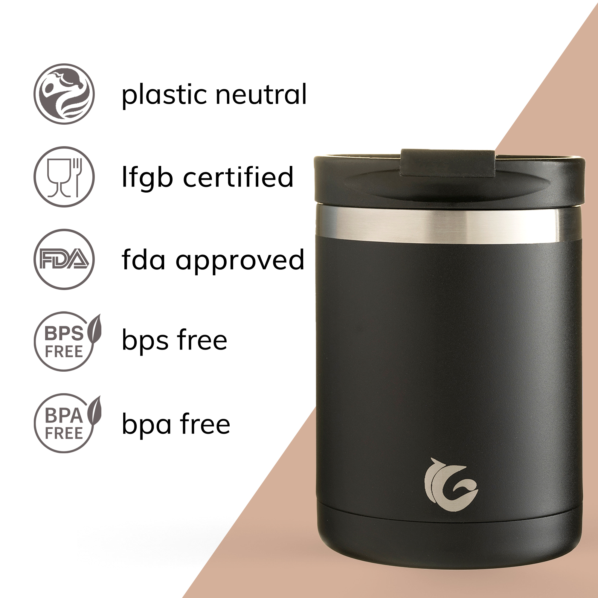 Perfect for bedside tables, the office or the micropub. Once you try this cup you will never leave the house without it. Keeps water ice cold overnight or keeps tea or coffee piping hot for hours. The BPA/BPS free clear cap is not leakproof but keeps your drink snuggly.